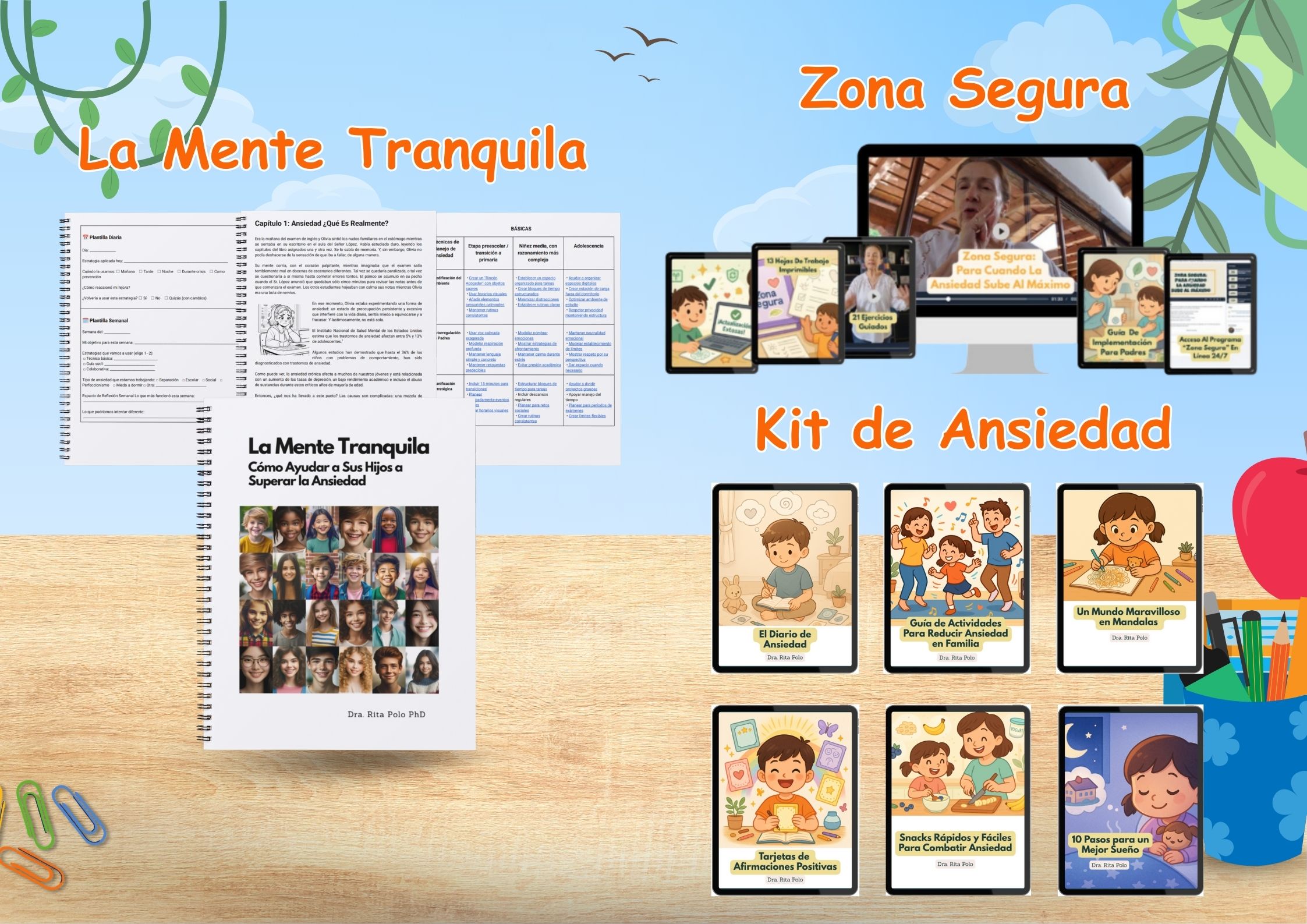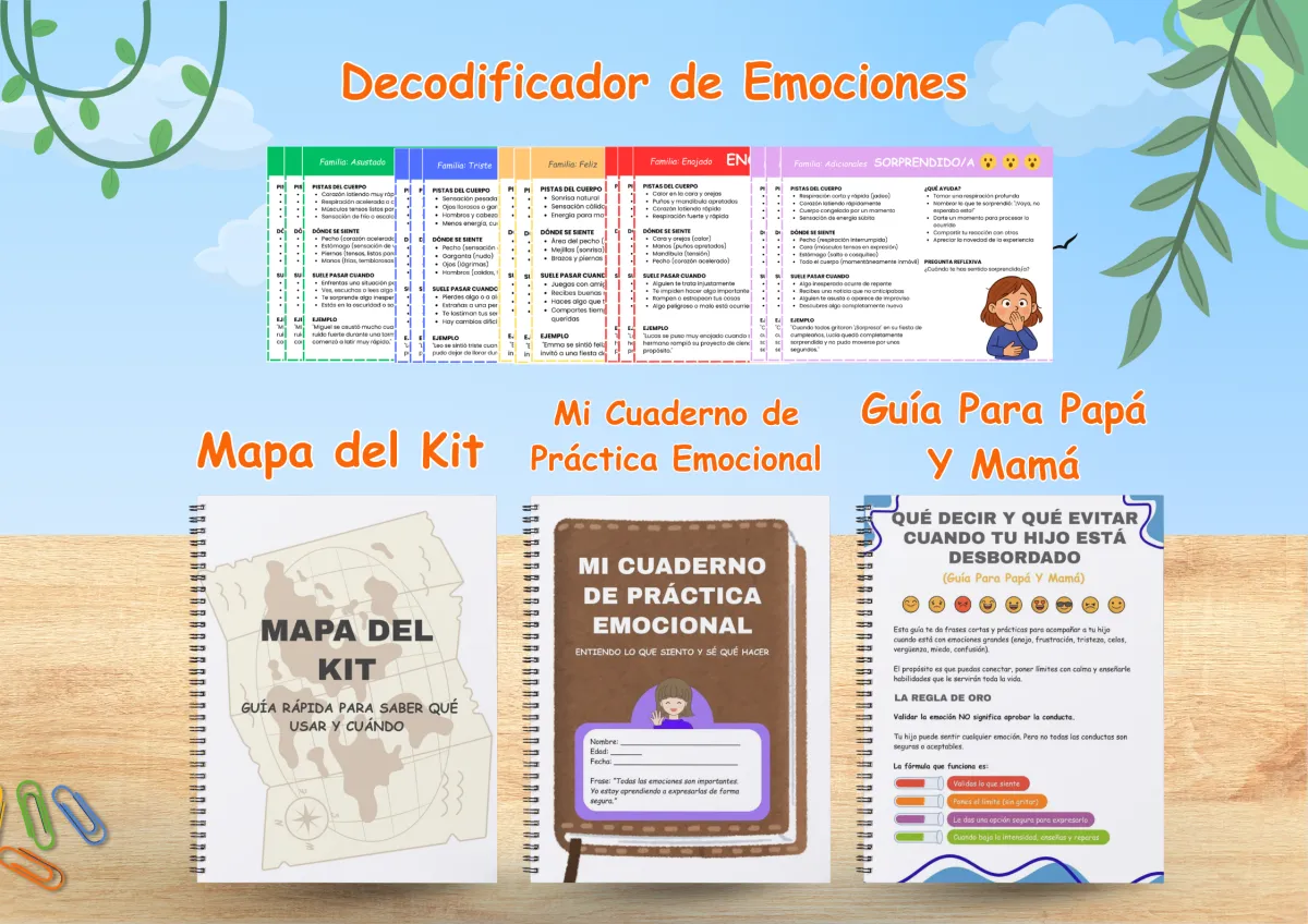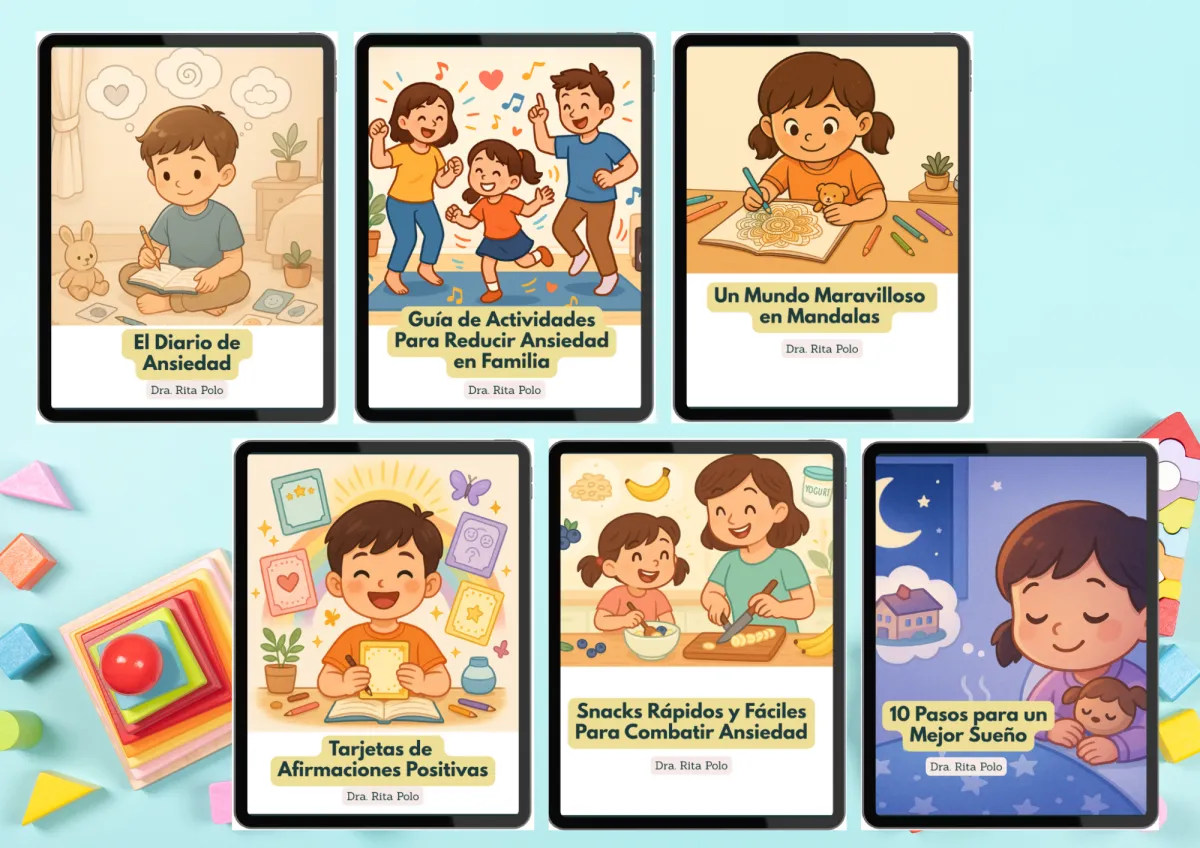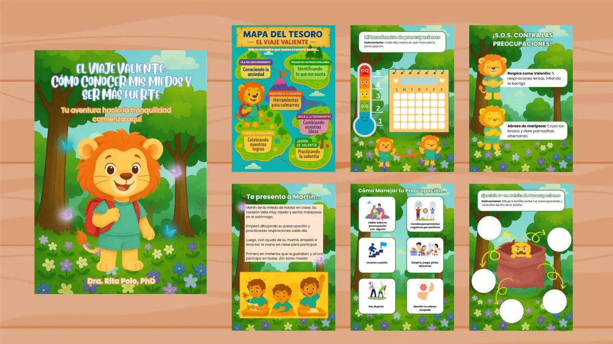 Es un cuaderno de trabajo interactivo que combina terapia de dibujo con ejercicios cognitivos diseñados para que tu hijo reconozca, analice y controle sus preocupaciones de forma visual y creativa.